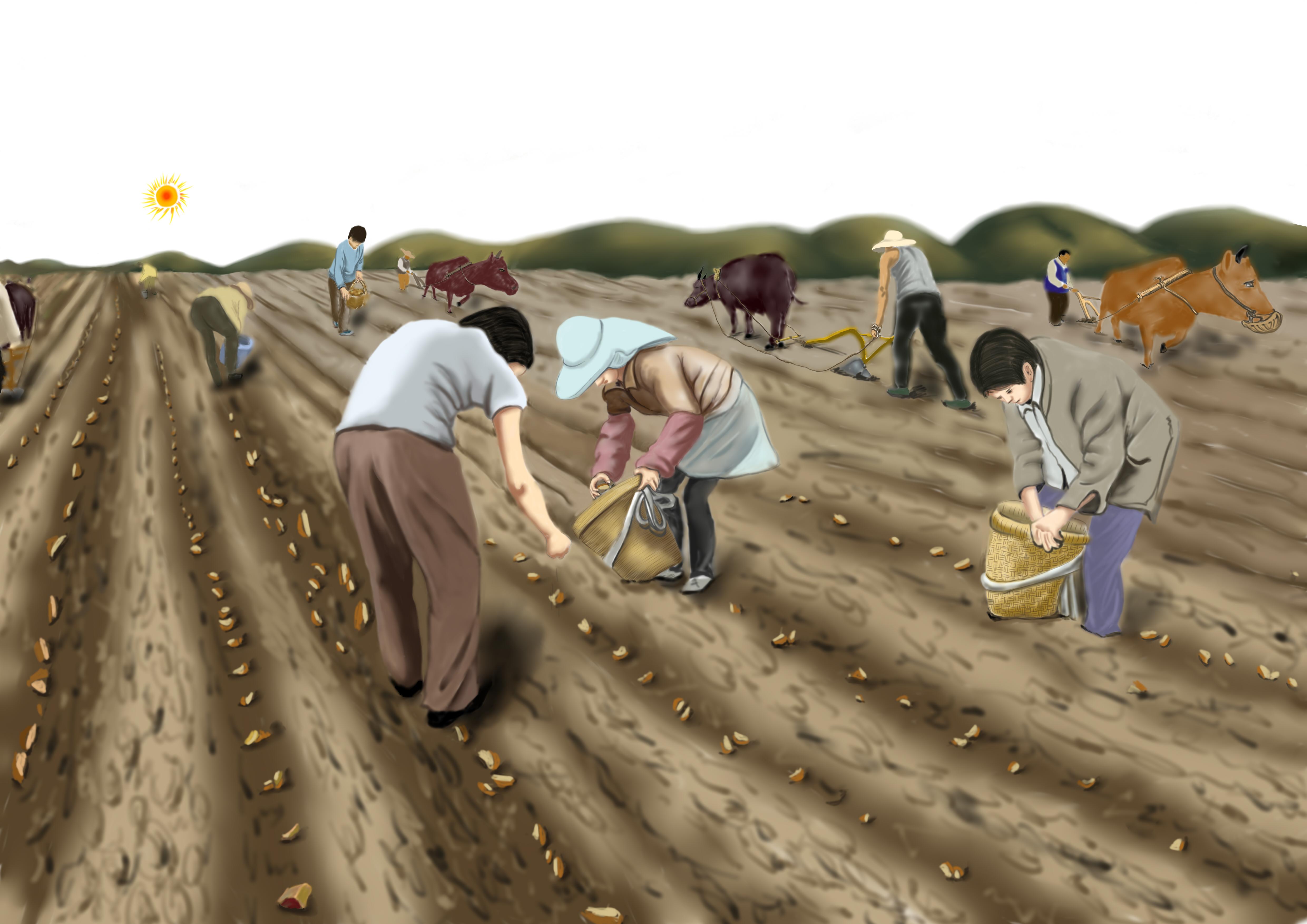 中耕松土,使結(jié)薯層土壤疏松通氣,利于根系生長、匍匐莖伸長和塊莖膨大。出苗前如土面板結(jié),應(yīng)進(jìn)行松土,以利出苗。齊苗后及時進(jìn)行第一次中耕,深度8-10厘米,并結(jié)合除草,第一次中耕后10-15天,進(jìn)行第二次中耕,宜稍淺?,F(xiàn)蕾時,進(jìn)行第三次中耕,比第二次中耕更淺。并結(jié)合培土,培土厚度不超過10厘米,以增厚結(jié)薯層,避免薯塊外露,降低品質(zhì)。